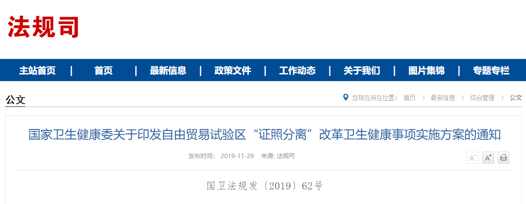 2019-12-19 查看更多近日,國家衛(wèi)健委發(fā)布《關(guān)于印發(fā)自由貿(mào)易試驗區(qū)“證照分離”改革衛(wèi)生健康事項實施方案的通知》(以下簡稱《通知》),公布12個醫(yī)改實施方案。此次衛(wèi)生健康領(lǐng)域的“證照分離”是要貫徹落實《國務(wù)院關(guān)于在自由貿(mào)易試驗區(qū)開展“證照分離”改革全覆蓋試點(diǎn)的通知》…