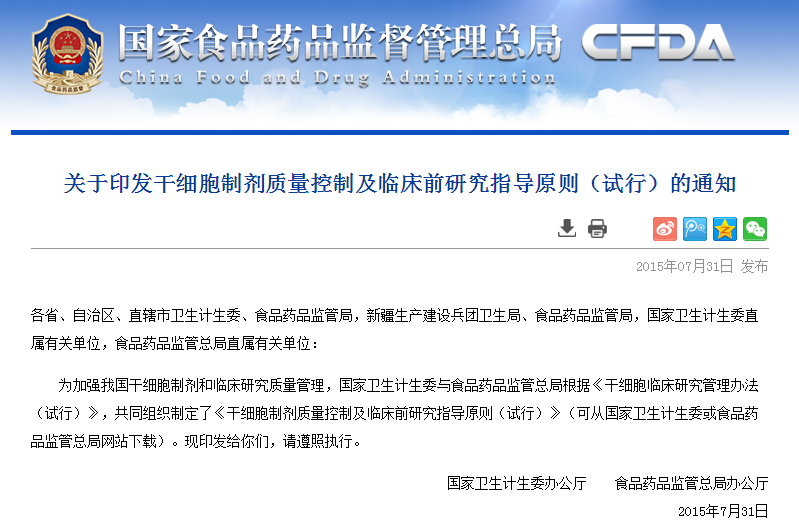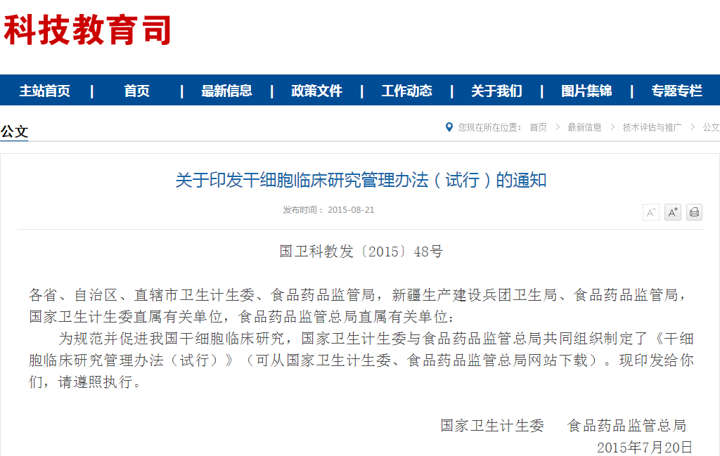 2015-07-31 查看更多各省、自治區(qū)、直轄市衛(wèi)生計生委、食品藥品監(jiān)管局,新疆生產(chǎn)建設兵團衛(wèi)生局、食品藥品監(jiān)管局,國家衛(wèi)生計生委直屬有關單位,食品藥品監(jiān)管總局直屬有關單位: 為規(guī)范并促進我國干細胞臨床研究,國家衛(wèi)生計生委與食品藥品監(jiān)管總局共同組織制定了《干細胞臨床…