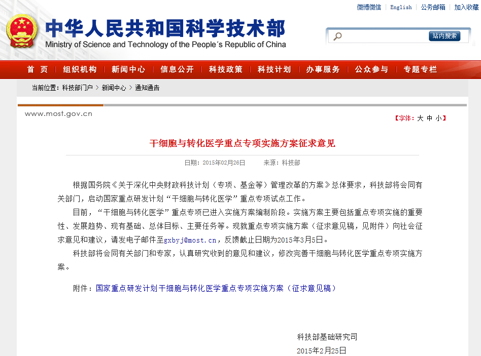 2015-08-28 查看更多干細胞與轉(zhuǎn)化醫(yī)學重點專項實施方案征求意見 根據(jù)國務院《關于深化中央財政科技計劃(專項、基金等)管理改革的方案》總體要求,科技部將會同有關部門,啟動國家重點研發(fā)計劃“干細胞與轉(zhuǎn)化醫(yī)學”重點專項試點工作。 目前,“干細胞與轉(zhuǎn)化醫(yī)學”重點專項已進入…